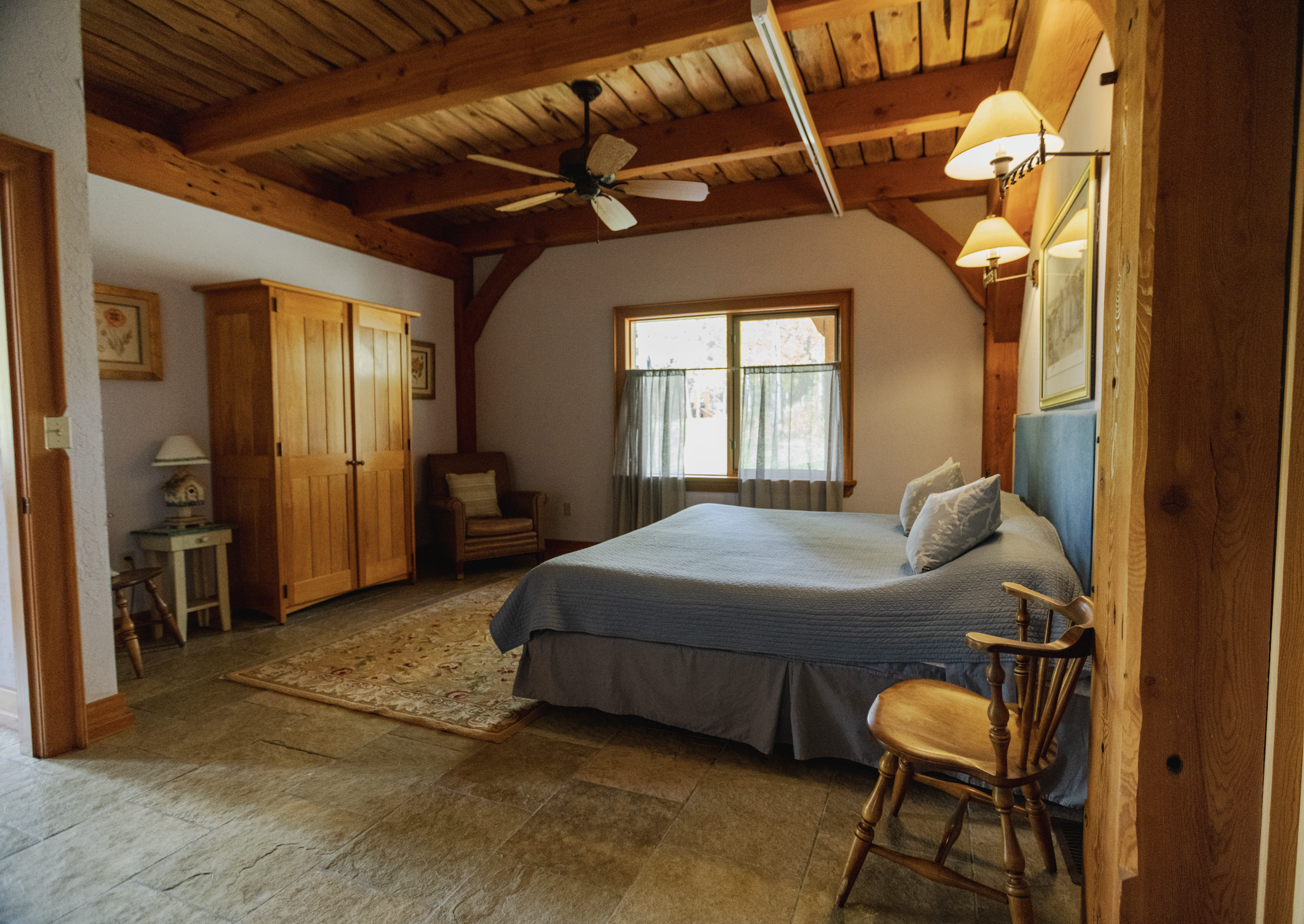 Carl’s House is a striking log residence that blends craftsmanship with comfort. Built by Swiss timber framers using the same century-old fir beams as the main house, it carries the same timeless character and enduring strength.